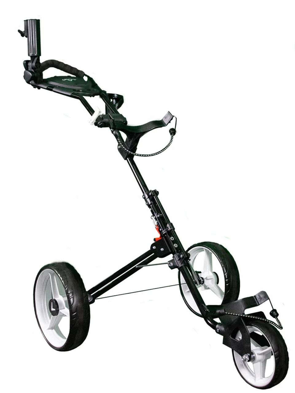 Available in Black. This lightweight aluminum push cart has two 12" back wheels, one 8" front wheel, and folds to 23"x14"x28"